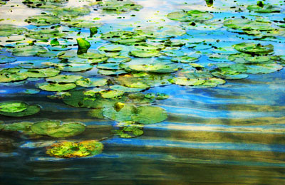 Ripples lapping at the pond's edge leave the lily pads rocking in the wake. This is the home of many a frog and fish and water bugs of all types. These plants provide shelter and protection for many that lurk beneath their sprawling leaves. In due season, this will be a floating flower garden, giving a whole new dimension to the lily pond.